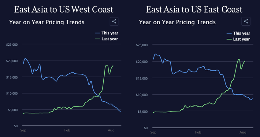 Freightios is the best free source I’ve found for historical trends in ocean freight prices. They recently put most of their indices behind a paywall, but still available are trailing 3-month data, and year over year trends. Here is China to US West & East Coast pricing year over year.